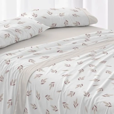 PRODUCT - Small watercolor leaves in shades of beige and maroon on a white background for a fresh and fresh set of sheets. Pillow made with application on the mouths light beige and beige trim. The fitted sheet is made in light beige. Dimensions of the set: a worktop measuring 240 x 270 cm. Two pillowcases 50 x 85 cm. One fitted sheet 150-160 x 190/200 cm. Available in various sizes. Features: 100% extra soft cotton fabric. Easy ironing. It is recommended to wash before first use. Long lasting. High mattress of 32 cm..A single pillowcase of 90,105,135 mm and two pillowcases for beds of 150/160,160,180 and 78.7 cm. in..Stamping A Single-sided MATERIAL: The fabric on which this sheet is made is 100% cotton with 144 thread count. A quality product, endorsed by Burrito Blanco. An initial gentle wash is recommended to acquire its ultimate touch and softness characteristics. MAINTENANCE: Machine wash with delicate program and maximum temperature of 40º. Do not bleach. Iron on medium heat. Do not dry clean. Machine dry, normal cycle