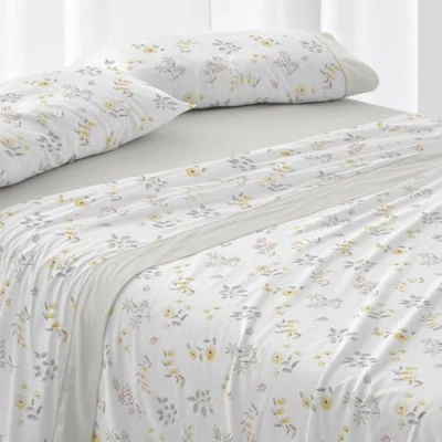 PRODUCT - Country flower print in shades of yellow, vanilla and a dot of red for this stylish and fresh sheet set. Leaves go in turquoise and gray, profiles of twigs in gray and brown. A sheet that breathes freshness and vitality. The countertop and the pillow are adorned with a light beige application on the embozos, further embellished with a medium beige trim. Fitted sheet in light beige. Dimensions of the set: a worktop measuring 240 x 270 cm. Two pillowcases 50 x 85 cm. One fitted sheet 150-160 x 190/200 cm. Available in various sizes. Features: 100% extra soft cotton fabric. Easy ironing. It is recommended to wash before first use. Long lasting. High mattress of 32 cm..A single pillowcase of 90,105,135 mm and two pillowcases for beds of 150/160,160,180 and 78.7 cm. in..Stamping A Single-sided MATERIAL: The fabric on which this sheet is made is 100% cotton with 144 thread count. A quality product, endorsed by Burrito Blanco. An initial gentle wash is recommended to acquire its ultimate touch and softness characteristics. MAINTENANCE: Machine wash with delicate program and maximum temperature of 40º. Do not bleach. Iron on medium heat. Do not dry clean. Machine dry, normal cycle