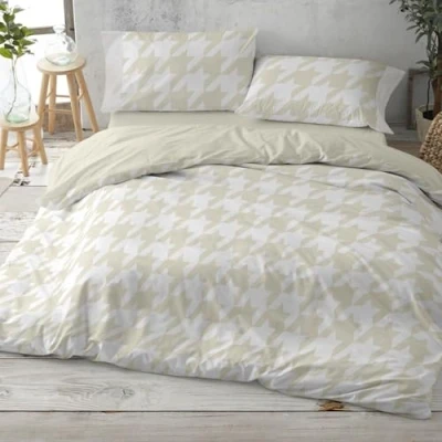 PRODUCT - 100% COTTON duvet cover set with a shaky geometric print, houndstooth XL in pastel wheat color on a white background. Back and fitted sheet in pastel wheat colour. Pillow printed as the cover and blank applications. Set dimensions: a duvet cover 220 x 260 cm. One pillowcase 45 x 155 cm. Fitted sheet 135 x 190/200 cm. Available in more sizes. Features: 100% extra soft cotton fabric. Long lasting. Does not pill. It is recommended to wash before first use. High mattress 32 cm. Available in a set of sheets Material: Soft fabric and a particularly comfortable feel are two of the main qualities of this 100% cotton duvet cover set which has 144 threads per square centimetre. A set of duvet cover, pillowcase and fitted sheet for which a pre-wash is recommended in order to acquire its full qualities. MAINTENANCE: Machine wash with delicate program and maximum temperature of 40º. Do not bleach. Iron on medium heat. Do not dry clean. Machine dry, normal cycle