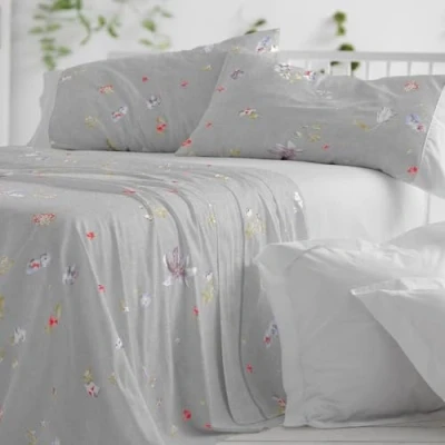 PRODUCT - Set of sheets with a print of different watercolor flowers, in white, red, blue-grey, purple and khaki, on a grey background with linen texture. Worktop with stitching in grey embozo with linen texture, and etampado detail simulating an embroidery in gray at 10 cm. of the edge. Pillow with the same design, with application in light grey. Adjustable fitted sheet in light grey. Set measurements: a countertop of 210 x 270 cm..One pillowcase of 45 x 155 cm. One fitted sheet 135 x 190/200 cm. Available in various sizes. ✅ Features: 100% extra soft cotton fabric. Long lasting. Does not pill. It is recommended to wash before first use. High mattress 32 cm. Available in a set of sheets and bouti MATERIAL: The fabric on which this sheet is made is 100% cotton with 144 thread count. A quality product, endorsed by Burrito Blanco. An initial gentle wash is recommended to acquire its ultimate touch and softness characteristics. MAINTENANCE: Machine wash with delicate program and maximum temperature of 40º. Do not bleach. Iron on medium heat. Do not dry clean. Machine dry, normal cycle