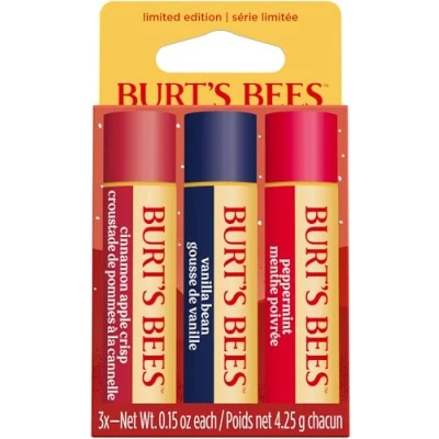 LIP BALM MULTI PACK/LIP BALM GIFT SET: Three delicious lip balm flavours: warm, spiced and comforting cinnamon apple crisp, sweet and creamy vanilla bean, refreshing and tingly peppermint ALL DAY MOISTURE: These lip balms provide all day moisture, and nourish and soften the lips with a rich, buttery non-greasy texture 100 percent NATURAL ORIGIN INGREDIENTS: Including responsibly sourced Beeswax that helps strengthen the skins moisture barrier; Coconut and Sunflower seed oil to nourish and smooth lips; with antioxidant-rich vitamin E Optimal CHRISTMAS GIFTS: This lip balm set makes the perfect stocking filler BURT'S BEES LIP CARE: The best lip balm for dry lips since 1984, All Burt's Bees products are Leaping Bunny Certified