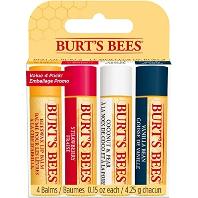 LIP BALM MULTIPACK: Moisturise dry lips and make savings with this Burts Bees Lip Balm Set including four naturally nourishing flavours: Beeswax, Strawberry, Coconut & Pear and Vanilla Bean all daymoisture: Hydrate and nourish dry lips with all day moisture and prevent lips from drying out with Burts Bees lip balms NOURISHING, HARD WORKING INGREDIENTS: Enriched with 100% natural origin, powerful ingredients, including responsibly sourced Beeswax, Coconut Oil and Shea Butter to deeply nourish and condition lips LIP REPAIR: With a matte finish and moisturising balm texture, these chapstick lip balms leave your lips feeling soft, smooth, healthy and supple BURT'S BEES LIP CARE: The best lip balm for dry lips since 1991
