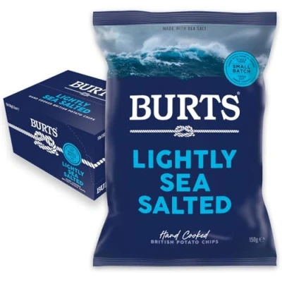 MADE TO SHARE - Enjoy more of our hand cooked, thick cut, made in Devon crisps - now in a 150 g share bag! Perfect for parties, special occassions, or simple snacks for family movie night. This comes with 10 x 150 g share bags to keep the good times rolling. DELICIOUS FLAVOUR - Burts crisps are made in Devon where we're proud of our natural British resources. Our Lightly Sea Salted potato chips are hand cooked using potatoes from the rich earth, and salt from the wild sea. Simple…but certainly not easy. HAND COOKED BRITISH SNACKS - Thick cut and small batch cooked for that perfect crunch, Burts crisps are better tasted than talked about. It only takes roughly 20 minutes from the potatoes arriving to a finished bag - that's how our crisps are so fresh. GLUTEN FREE AND VEGAN FRIENDLY - As well as being hand cooked, our Lightly Sea Salted chips are free from gluten and hydrogenated fat, they're non-GMO, and suitable for vegans and vegetarians. We're proud to be Red Tractor approved. MADE WITH CARE IN DEVON - Our chips are made from just four things: potatoes, oil, seasoning, and the expertise of some talented folk. Our potatoes come directly from growers we know, and the seasoning from local partners.