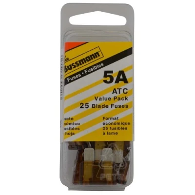 ATC blade fuse bonus pack of 25 5 amperes tan color Color coded to indicate ampere rating Enclosed element to protect against shocks and sparks Enclosed element is corrosion resistant for longer service life