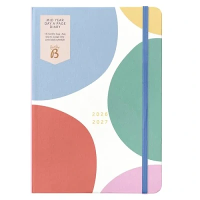 MID YEAR DAY A PAGE ACADEMIC DIARY - Make the academic year 2026 - 2027 your year to be beautifully organised with the Day a Page Diary from Busy B, featuring a soft multicoloured spot design cover. RUNS FROM AUGUST 2026 TO AUGUST 2027 – The Day a Page diary runs August to August, perfect for noting down classes, deadlines and other academic plans. IDEAL DESK DIARY – The perfect schoolbag, handbag or desk size, the page a day diary measures 15 x 21.5cm (approximately A5) when closed. Perfect for your daily classes and activities. DAY TO A PAGE FORMAT – See and plan your days the easy way, with generous writing space and a mini calendar for every day of the year, including Saturdays and Sundays. OTHER FEATURES – Includes a space for birthdays, yearly planner, elastic closure band, pen loop (pen not included) and ribbon page marker. Also includes a handy year planner, timetables, notes pages and a 2027/2028 year planner.