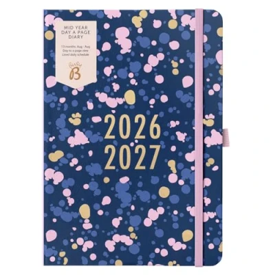 MID YEAR DAY A PAGE ACADEMIC DIARY - Make the academic year 2026 - 2027 your year to be beautifully organised with the Day a Page Diary from Busy B, featuring a soft navy spray design cover. RUNS FROM AUGUST 2026 TO AUGUST 2027 – The Day a Page diary runs August to August, perfect for noting down classes, deadlines and other academic plans. IDEAL DESK DIARY – The perfect schoolbag, handbag or desk size, the page a day diary measures 15 x 21.5cm (approximately A5) when closed. Perfect for your daily classes and activities. DAY TO A PAGE FORMAT – See and plan your days the easy way, with generous writing space and a mini calendar for every day of the year, including Saturdays and Sundays. OTHER FEATURES – Includes a space for birthdays, yearly planner, elastic closure band, pen loop (pen not included) and ribbon page marker. Also includes a handy year planner, timetables, notes pages and a 2027/2028 year planner.