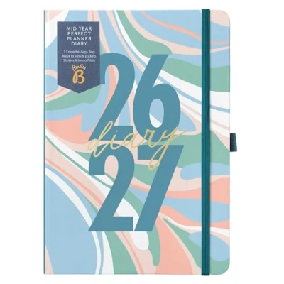 MID YEAR WEEKLY PLANNER DIARY - Make the academic year 2026 - 2027 your year to be beautifully organised with the Perfect Planner diary from Busy B, featuring a beautiful marble design cover with gold foil detailing, elastic closure band, pen loop (pen not included) and ribbon page marker. Runs August 2026 to August 2027. DESK DESIGN – This academic planner is the perfect size for your desk or handbag. The Perfect Planner measures 15cm x 21cm (approximately A5) when closed. WEEK TO VIEW AND NOTES – This planner’s format is week to view, with beautiful illustration throughout and spaces for notes each week. Keep track of future plans and deadlines with the mini calendars on each page. OTHER FEATURES - Pull-out sticker sheets and tear out reminders - perfect for making important meetings & appointments stand out and keeping on top of your to-do lists. Pages to record birthdays, expenses and important contacts so you can keep everything you need in one handy place. HANDY POCKETS – The Perfect Planner includes a month-per-page year calendar and four pockets for storing important letters, appointments and other bits and bobs.