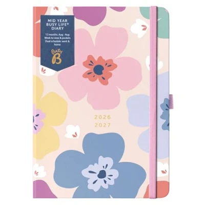 Busy B Diary A5 Mid Year Academic Life Weekly Journal Aug '26 '27 Floral Cover Planner with Dual Schedules, Calendar, Pen Loop, Pockets & Elastic Closure