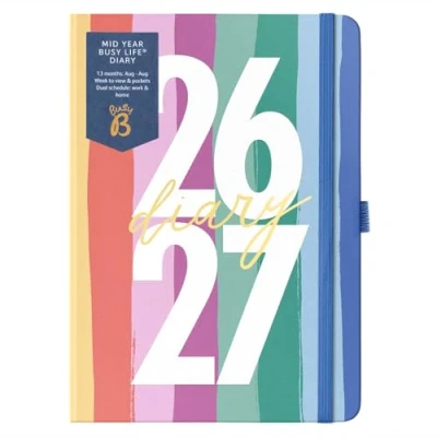 Busy B Diary A5 Mid Year Academic Life Weekly Journal Aug '26 '27 Multi Stripe Cover Planner with Dual Schedules, Calendar, Pen Loop, Pockets & Elastic Closure