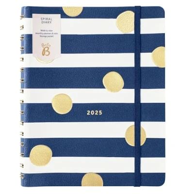 Busy B Spiral Weekly Diary 2025 Navy Stripe & Gold Spot Faux Leather Cover Week to View Layout, Notes, Monthly Planners Tabs, Storage Pocket Elastic Closure Band Jan Dec