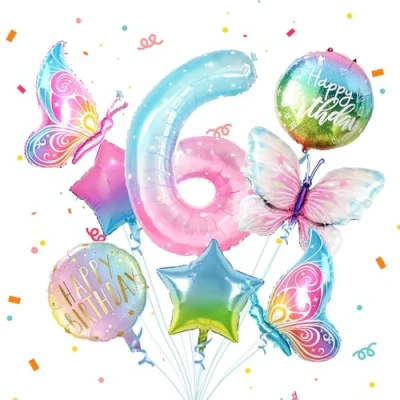 BIRTHDAY DECORATIONS FOR GIRLS: 6th Butterfly Birthday Decoration Set includes: 1* Butterfly Foil Balloon (29.5"*38.9"), 2* Butterfly Foil Balloon (29.9"*21.2"), 2* Pentagram Gradient Balloons, 2* Round Balloons with "Happy Birthday" printed on them, and 40" Numeric Balloons 6. BUTTERFLY BIRTHDAY DECORATION: Butterfly Birthday Decoration 2th features a butterfly design, we use gradient colours such as light blue, pink and different shapes of foil balloons to add magical colours to your celebration. HIGH QUALITY: The butterfly decoration set is made of high quality materials, durable, eco-friendly and reusable. Butterfly birthday decoration balloons are made of sturdy aluminium foil, helium or air supported. EASY TO USE: comes with all necessary accessories, no need for complicated preparation, our set contains all the decorations you need. SUITABLE FOR ALL KINDS OF PARTIES: these butterfly balloons are perfect for all kinds of party decorations, ideal for butterfly birthday party decorations, children's birthday parties, baby showers or other holiday party events., Manufacturer: oulai