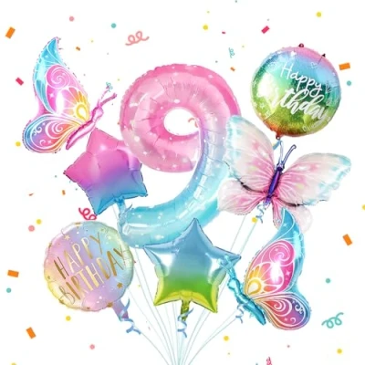 BIRTHDAY DECORATIONS FOR GIRLS: 9th Butterfly Birthday Decoration Set includes: 1* Butterfly Foil Balloon (29.5"*38.9"), 2* Butterfly Foil Balloon (29.9"*21.2"), 2* Pentagram Gradient Balloons, 2* Round Balloons with "Happy Birthday" printed on them, and 40" Numeric Balloons 9. BUTTERFLY BIRTHDAY DECORATION: Butterfly Birthday Decoration 2th features a butterfly design, we use gradient colours such as light blue, pink and different shapes of foil balloons to add magical colours to your celebration. HIGH QUALITY: The butterfly decoration set is made of high quality materials, durable, eco-friendly and reusable. Butterfly birthday decoration balloons are made of sturdy aluminium foil, helium or air supported. EASY TO USE: comes with all necessary accessories, no need for complicated preparation, our set contains all the decorations you need. SUITABLE FOR ALL KINDS OF PARTIES: these butterfly balloons are perfect for all kinds of party decorations, ideal for butterfly birthday party decorations, children's birthday parties, baby showers or other holiday party events., Manufacturer: oulai