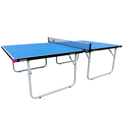 The Butterfly Compact 19 indoor table tennis table with a strong steel frame and a 19mm playing surface is a good model for home or school use and where more compact storage is needed. It comes with 2 wheels on each half which you can use when the table is vertically folded to transport it more easily. The steel frame improves durability and the effective folding system helps you store the table to save floorspace when not in use. It's ready assembled and includes 2 reverse sponge bats and 3 quality practice balls.