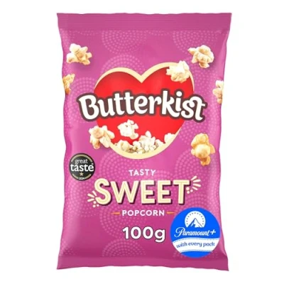 Our moreish Sweet popcorn is so irresistible, you’ll be going back for more. Perfect for a family night in. < Please note that Paramout + promotional packaging is distributed at random, and we cannot guarantee that the pack you receive will include the promotional offer.> Ingredients: Popped Maize, Sugar, Rapeseed Oil, Emulsifier: Sunflower Lecithins. Gluten Free, Source of Fibre, Made from Wholegrains, No Artificial Colours or Flavours, Suitable for Vegetarians. We’re Butterkist. Creating Smiles Since 1914. More Irresistible Flavours to Enjoy! Butterkist Deliciously Sweet & Salty Popcorn & Butterkist Crunchy Toffee Popcorn. Everyone loves the Irresistible Taste of our popcorn. It's a Big Bowlful of Unstoppable Fun, Perfectly popped and always ready to share. Try It, Love It, Share It.