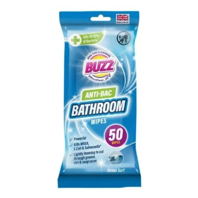 Transform your bathroom cleaning routine with Buzz Bathroom Ocean Wipes! Our multi-surface wipes kill 99.99% of bacteria and are lightly foaming to easily cut through grease, dirt, and soap scum. With 50 wipes in each pack, enjoy a sparkling and bacteria-free bathroom in no time.. 1 x Buzz Bathroom Ocean Wipes 50 Pack. Kills 99.9% of bacteria. Cuts through grease