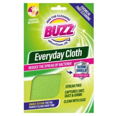 Effectively clean around your home with the powerful everyday microfibre cleaning cloth by Buzz Clean. This cleaning cloth features a unique texture that allows for the perfect clean every time. Treated with long-lasting protection to prevent bacterial growth and reduce the spread of bacteria between household surfaces.. Simply dampen the cloth lightly with water and wipe down surfaces that need cleaning. Suitable for machine wash under 40°C.. 1 x Buzz Everyday Microfibre Cleaning Cloth. Streak free. Captures dirt, dust & grime. Clean with ease. 85% polyester, 15% polyamide