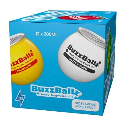 MIXED PACK OF 12 READY TO DRINK COCKTAILS - If you're a big fan of BuzzBallz, our mixed cases are perfect for you! 12 BuzzBallz Cocktails in three flavours: 4 each of Tequila ‘Rita, Strawberry ‘Rita, Chili Mango, Choc Tease, Lotta Colada and Espresso Martini EXCITING FLAVOURS - Share with friends, at home or outdoors and enjoy a full cocktail experience with no need for a bartender. Made with premium spirits, real fruit juices, and cocktail ingredients. PRE-MIXED & READY TO DRINK - Made in the USA at bar-strength for a more authentic cocktail experience. MULTIPACK TEAR ‘N’ SHARE – Three times the enjoyment in a handy stack of three recyclable PET containers. HAVE A BALL - Our convenient cocktails are the perfect way to have a ball with your friends. Enjoy at