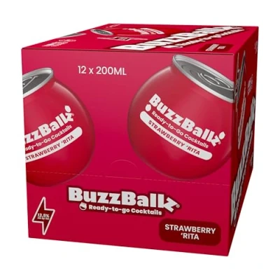 STRAWBERRY MARGARITA: Taste the tropics with every sip of this delicious blend of vodka, natural flavors, and fruit flavors. Packed with fresh and crisp citrus, this strawberry margarita is the equivalent of fun in the sun with every sip READY TO SIP: No mixing, no fuss - this Strawberry Rita comes perfectly blended and chilled in its iconic BuzzBallz orb. Just pop it open and enjoy bar-quality flavour anytime, anywhere ADVENTURE READY: Made with sturdy PET packaging that’s tough enough for festivals, picnics, beach days or BBQs. Light, shatterproof and easy to pack - BuzzBallz goes wherever the good times roll! FULL‑STRENGTH COCKTAIL: Big taste, bold buzz - BuzzBallz packs 13.5% ABV of pure fun in every pour, serving up real cocktail flavour in a perfectly balanced, ready‑to‑drink sphere REINVENTING HAPPY HOUR: Founded by entrepreneur Merrilee Kick, BuzzBallz is a woman‑founded brand shaking up cocktails with innovation and fun. BuzzBallz crafts happiness with purpose and sustainability MULTIPACK: 12-pack, 200ml