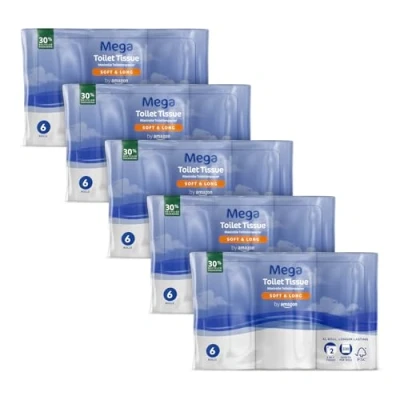 By Amazon Mega Toilet Roll, 2 Ply, Soft and Long, 9900 Sheets, Pack of 5, 30 Rolls, 330 Sheets per Roll Extra Long Lasts Longer