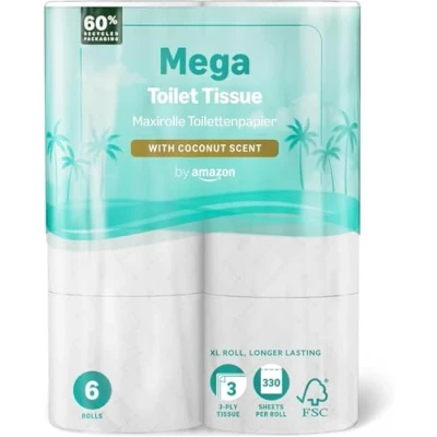by Amazon Mega Toilet Roll, 3 ply, 6 Rolls, with Coconut Scent, 1 Packs of 330 Sheets per Roll