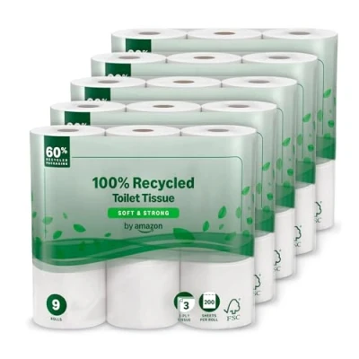 by Amazon Toilet Roll, 3 ply 100% Recycled, Soft and Strong, 45 Rolls (5 Packs of 9), 200 Sheets per FSC Certified