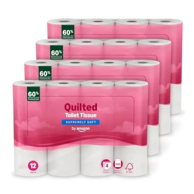 by Amazon Toilet Roll, 4 ply Quilted, Supremely Soft, 48 Rolls (4 Packs of 12), 160 Sheets per FSC Certified