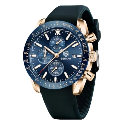 Amazon Design Concept: BY BENYAR is dedicated to glamor of men's wrists. BY-5140 mens dress watch embraces 45MM classic big face dial, timeless chronograph design, fashion hands/markers, calendar window, tachymeter numerals on the bezel, Combining elegance, fashion and power, will become a fashion statement for your versatile style. Benyar men's wrist watches are special designed for men who looking for detail and taste! Precision Timekeeping: BY-5140 men's watch features a high-quality original imported quartz movement to provide stable and accurate time. Whether for meaningful gatherings or formal business occasions, benyar analog quartz watch men provides you with precise timekeeping. Built-in high-quality BATTERY, the service life is as long as 2-3 years. With three chronograph sub-dials for 1/10 seconds, seconds and minutes, this chronograph watches for men cater to various timing needs in your daily life. Waterproof Silicone Watch: Silicone strap has better anti-abrasion and waterproof characteristics than leather, can meet daily waterproof needs. Flexible and elastic design, it fits perfectly around the wrist and is lightweight and comfortable to wear. Silicone watch also has excellent properties in terms of sweat and moisture resistance. After absorbing enough light energy, you can check the time of the watch in a dark environment. Exquisite Gift: Timeless elegance wrapped in precision timekeeping, BENYAR mens designer watch is a gift to commemorate every precious moments. Our casual men's watches blend style and functionality, symbolize lasting bonds and treasured memories. Celebrate yourself or someone you love a special gift that will stand the test of time! Customer Satisfaction: BY BENYAR offers a 2-year after sales service. We pledge to offer high-quality watches that are rigorously tested and quality controlled for precision and durability. Any problems about our wrist watches for man, please contact us first via email (click "BENYAR FLAGSHIP STORE" at the bottom of shopping cart), and we will provide exceptional after-sales service to meet our customers' needs.