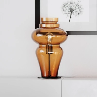 The Dolores Brandy table lamp captivates with its beautiful, sculptural design and its direct yet cosy light. The lamp is part of a whole series, all of which have the same voluminous glass lampshade. Each light in the series is available in two colour variants. One has a smoky grey lampshade for more diffuse lighting, while the other has a deep cognac-coloured lampshade that makes the light warmer and more inviting. In both variants, the coloured glass ensures that the light can shine directly and glare-free in all directions, giving you the best of both worlds. As the Dolores series consists of table, ceiling and pendant lights that match each other in shape and colour, you can easily combine them to create a harmonious lighting scheme.