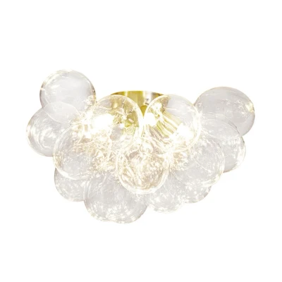 Lights.coGross ceiling light with 24 glass spheres The 24 glass spheres of the Gross ceiling light float around the golden ceiling canopy like delicate soap bubbles, giving the light the appearance of a large cloud or a cluster of small balloons. The six G9 bulb sockets are also located on the ceiling canopy. These are used not only to generate ambient light, but also to illuminate the spheres, which in turn transport a sparkle and spotlight into the room.