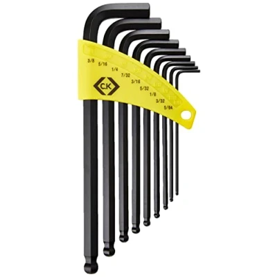Ball-ended Long-arm Hexagon Key Set of 9 AF~ Chrome vanadium steel, hardened & tempered for strength & durability~ Ball ended for use at an angle of up to 25° where access is restricted~ Supplied in a storage holder~ Contents: 5/64, 3/32, 1/8, 5/32, 3/16, 7/32, ü, 5/16 und 3/8Technical Specification:CE Certified: NoConflict Materials Content : NoREACH Content Status SVHC Free or Contains SVHC: SVHC freeRoSH Regs Within Scope: NoBatteries Included: NoBattery Powered: NoCharger Included: NoMains Powered: NoDimensions: Length: 14mm x Height: 180mmWeight: 0.338KgWarranty: 12 months. C.K products are guaranteed for 1year against imperfect materials or workmanship. Damage caused through normal wear and tear or resulting from inappropriate use, is not covered.