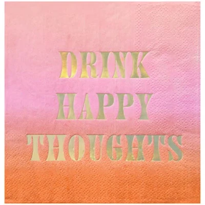 Package includes (20) disposable paper cocktail napkins. 3-ply drink napkins measure 5" x 5". These fun decorative cocktail napkins feature a pink to orange ombre with gold foil text that reads "Drink Happy Thoughts". Perfect for summer get togethers, cocktail hours, dinner parties, and more. Our disposable drink napkins make clean super simple.