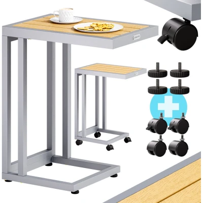 General description With the CASARIA® C Shape Side Coffee Sofa Table, you can enhance your living room or garden with a stylish and functional piece. Its weatherproof materials make it an ideal companion for outdoor lounging or as a side table next to your sofa. The timeless design also makes it suitable for use as a bedside table or a laptop table. The C-shaped steel frame allows for easy placement under sofas or beds, while the four wheels, two of which are lockable, provide effortless mobility. If preferred, the wheels can be replaced with height-adjustable feet. Technical specifications Frame material: galvanized steel Table top material: WPC (Wood-Plastic Composite) Dimensions (LxWxH): 50x40x66 cm Dimensions of wheels with brakes: 7x7 cm Dimensions of wheels without brakes: 7x5 cm Dimensions of adjustable feet: 2x2x2.4 cm Load capacity: 25 kg Other information Suitable for indoor and outdoor use Weatherproof materials with a long service life Low maintenance and easy to clean