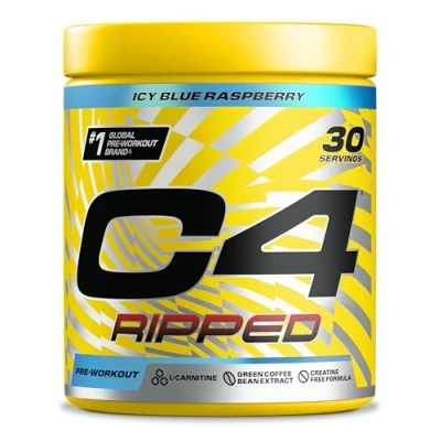 ENERGISING PRE WORKOUT: C4 Ripped is a Creatine-free pre workout supplement. Taken before your workout, C4 Ripped employs a range of nutrients such as L-Carnitine, Green Coffee Bean Extract, and Capsimax Cayenne Fruit Extract, whilst also supporting your energy to perform at your best. EXPLOSIVE ENERGY BOOST: The 150mg caffeine in C4 Ripped pre work out provides you with the edge to power through your training sessions, getting you primed for your workouts with an electrifying burst of energy and laser focus. SUSTAINED ENERGY: Push past your limits with the help of 150mg Caffeine, 1600mg CarnoSyn Beta Alanine, 500mg L-Carnitine, 200mg Green Coffee Bean Extract, and 50mg Capsimax Cayenne to help increase your performance for the toughest gym sessions. GREAT TASTING WITH ZERO SUGAR: This refreshing icy blue raspberry flavoured pre workout sets you up for success using zero sugars and vitamins B6, B9, and B12 - also available in tropical punch, raspberry lemonade, and cherry limeade. HOW AND WHEN TO USE: Take one serving (1 level scoop) of C4 pre workout mixed with 250ml of water 20-30 minutes before training to prepare yourself for a tough session. We recommend you drink plenty of water during your workout. 1 pack has 30 servings.