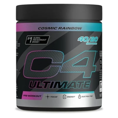 ULTIMATE PRE WORK OUT: Dominate your fitness goals with C4 Ultimate pre workout, a powerhouse of a mix fully loaded with 300mg caffeine, 6000mg L Citrulline, 4800g CarnoSyn Beta Alanine, and additional supporting ingredients to deliver explosive energy, performance, and focus. INTENSE FOCUS AND ENERGY: Fuel the toughest gym sessions with our most advanced and comprehensive pre-workout. Containing 300mg high caffeine and 4800mg CarnoSyn Beta-Alanine to deliver the ultimate explosive high caffeine pre workout. TRIED AND TESTED INGREDIENTS: With our 20 years of experience and clinically verified patented ingredients, we've developed an advanced and comprehensive mix to support alertness, focus and attention for peak physical performance. GREAT TASTING WITH ZERO SUGAR: This refreshing Cosmic Rainbow flavoured pre workout sets you up for success with vitamins B6 and B12, amino acids, and a perfect balance of electrolytes without any sugar - also available in Tutti Frutti, Bubblegum, and Lemon Twist. HOW AND WHEN TO USE: Take one serving (1 or 2 level scoops) of C4 pre workout mixed with 700ml of water 20-30 minutes before training to prepare yourself for a tough session, and drink plenty of water during your workout. 1 pack has 20 servings if double scooped, or 40 if single scooped.