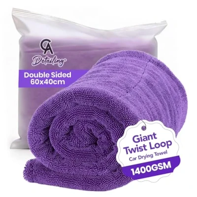 ULTRA-ABSORBENT 1400GSM BEST CAR DRYING TOWEL: This heavyweight, ultra-plush large microfiber cloth absorbs water instantly, holding far more than standard towels to drastically cut drying time and leave a streak-free, waterless finish. PREMIUM PAINT-SAFE CONSTRUCTION: Engineered with a triple twisted loop weave, this ultra-soft towel glides safely over clear coat, paint, and automotive glass, delivering a flawless, scratch free finish every time. DURABLE AND REUSABLE - High-quality stitching and machine washable. Our durable microfibre cloth car cleaning withstand repeated washing without shrinking, fraying, or losing its effectiveness. Designed to dry quickly, making it easy to reuse and reducing the risk of bacterial growth. Perfect for frequent use! EXPERIENCE THE DIFFERENCE IN OUR TRIPLE TWISTED DESIGN: Our premium 1400GSM drying towel offers a uniquely substantial feel. Its weight allows it to contour perfectly to panels, delivering an easier, faster, and more satisfying dry that outperforms standard market offerings. TWO PROFESSIONAL SIZES: Choose from XL (60x40cm) for spot drying and windows, or the large XXL (80x50cm) size for maximum coverage and drying power on entire vehicle panels.