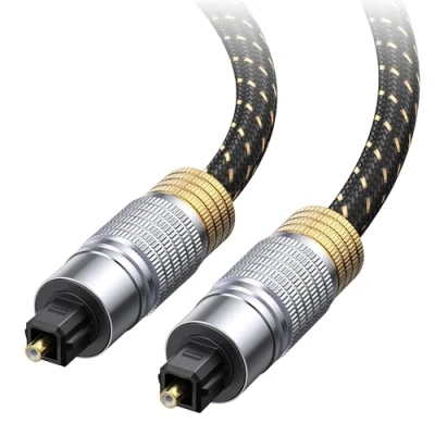 Heavy duty Toslink audio cable connects Blu-ray players, satellite DVRs, computers, DAT recorders, game consoles, or other audio devices with a digital optical interface (S/PDIF) to your AV receivers Premium Toslink cable engineered with durable PVC layers and braided jacket increases durability and protects the cable from nicks, cuts, and kinks Polished heavy duty metal connectors and gold plated tips provide a secure and corrosion free connection with this heavy duty optical digital audio cable 360 degree grip treads help easy plugging and unplugging. Fiber optical cable eliminates electromagnetic interference (EMI) and radio frequency interference (RFI) Supports uncompressed PCM audio or compressed 5.1 and 7.1 surround sound including Dolby Digital Plus and DTS-HD