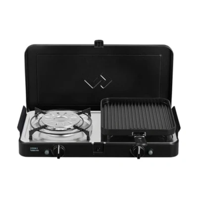 Flame Failure Device (FFD), Turbo Burner positioning to improve wind resistance, dual burner, integrated piezo igniter, thermoplastic base with stainless steel burner top, heat deflector plate on the base, GreenGrill ceramic Flat Grill Plate, GreenGrill ceramic Ribbed Grill Plate, grill plate handle, removable pot stand, coffee pot stand, push button piezo ignition per burner, convenient storage bag, integrated rotating quick release (QR) coupling, Weight: 13.889122506 pounds, Manufacturer: Cadac