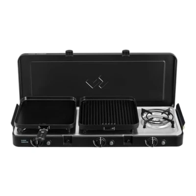 Flame Failure Device (FFD), Turbo Burner positioning to improve wind resistance, triple burner, integrated piezo igniter, thermoplastic base with stainless steel burner top, heat deflector plate on the base, GreenGrill ceramic Flat Grill Plate, GreenGrill ceramic Ribbed Grill Plate, grill plate handle, removable pot stand per burner, push button piezo ignition per burner, convenient storage bag, integrated rotating quick release (QR) coupling, Weight: 20.723452628 pounds, Manufacturer: CADAC