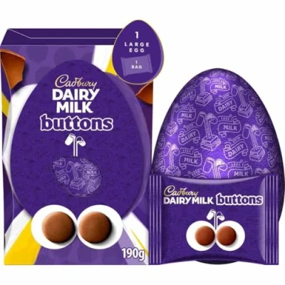 FESTIVE TREAT: A delicious Cadbury Dairy Milk Chocolate Easter Egg perfect for a festive celebration GIANT BUTTONS: Indulge in smooth Cadbury chocolate with giant buttons included in this gift bag with a smooth shell GIFT BOX: This 195g Easter egg is presented beautifully, ideal as a special gift or to treat yourself to some creamy sweetness CELEBRATION READY: Get ready for the Easter celebration with this delectable and iconic Cadbury chocolate treat spoiling your taste buds PERFECT GIFT: Treat someone special or indulge yourself with this delightful UK favourite, full of rich and creamy goodness