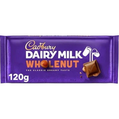 Cadbury Dairy Milk Whole Nut Bar, Hazelnuts Covered in Creamy Chocolate, 120 g Bar (Pack of 1)