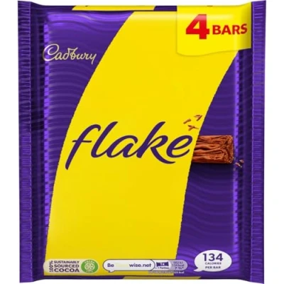 CRUMBLY TREAT: Indulge in the crumbly goodness of Cadbury Flake; perfect for sharing or as a delicious dairy milk treat MULTIPACK: 4 x 25.5g bars, ideal for stocking up and enjoying anytime you fancy a chocolate fix FLAKE DELIGHT: Each bar is made with genuine Cadbury chocolate for that true Flake experience SHAREABLE: Delightful treat to share with family and friends, offering them a taste of this iconic favourite from Cadbury’s range IRRESISTIBLE FLAVOUR: Enjoy the creamy taste of dairy milk chocolate in each delicate flake bar bite