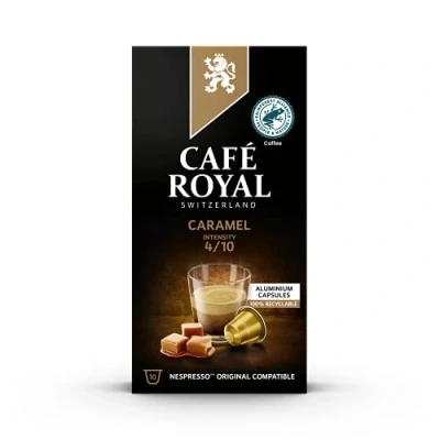 Café Royal, Caramel flavoured coffee, 100 Nespresso (R) compatible capsules, 80 percent recycled Aluminium, Rainforest Alliance certified, Arabica