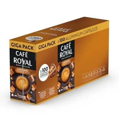 Café Royal, Caramel flavoured Promo Pack, 100 Nespresso (R) compatible capsules, 80 percent recycled Aluminium, Rainforest Alliance certified, Arabica coffee,