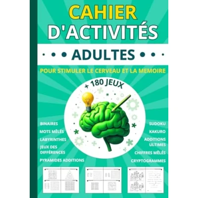 Cahier d'activités adultes: livre + 180 jeux adultes et seniors pour stimuler le cerveau la mémoire Mots mêlés Sudoku Labyrinthes ... différences idée cadeau femme homme