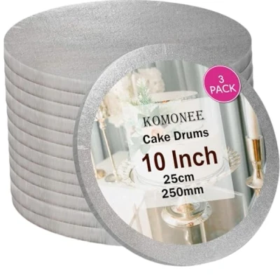 Size: 10" Inch Colour: Silver Quantity: 3 Cake Drums They are lightweight and come delivered wrapped for protection. These cake boards are perfect for displaying your finished baked articles including desserts, cakes, cupcakes, pies etc. Perfect for baking at home, weddings, birthdays, anniversaries or other celebrations. These display stands are great for the regular cake makers and decorators.