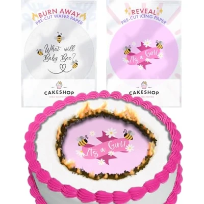 Cakeshop Burn Away Edible Cake Topper Pack 1 x Icing Sheet & Wafer Cute it’s a Girl Gender Reveal Bee Theme Personalise With Your Custom Text Multiple Shapes Sizes to Choose