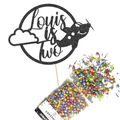 Cakeshop Cake Decoration Pack Aeroplane Birthday Theme Premium Double Sided Glitter Card Topper & of 24 PreCut Edible Wafer Toppers Custom Name Age (Black)