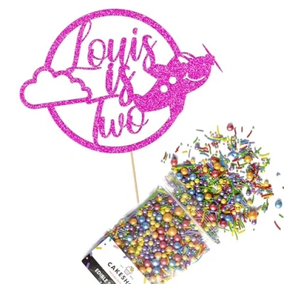 This Cakeshop Cake Decorating Pack includes 1 x 480gsm Double Sided Glitter Card Topper & 25g Cake Sprinkles (option to upgrade to 50g while customising) - perfect for your party or celebration! Cakeshop Sprinkles are Vegan, Gluten Free, Lactose free and Nut Free, all while looking amazing in striking colours and an assortment of sizes for a truly 'premium' finish Size: Sprinkles pack (perfect for a large cake) 25g, you can also upgrade to a 50g pack when customising your topper | Glitter Topper Approx 152mm (6") x 175mm (7") Toppers make a great keepsake to remember this special occasion forever, often our customers will remove the support sick and use on bedroom doors (until their next birthday!) Cakeshop Glitter Toppers are made from 480gsm premium double sided glitter card, select which colour topper you'd like then click 'Customise' to add your text personalisation and choose your sprinkles Choose from either Metallic or Rainbow sprinkles and upgrade to 50g packs in the 'Customise' section, so that you can match your sprinkles to your theme (or save them for next time!) All 'Cakeshop Cake Decorating Packs' come beautifully packed with simple to understand instructions so that you can quickly turn any cake, home made or shop bought (we wont tell!) into the perfect cake After you have added your custom information in the 'Customise Now' section our designers hand make your topper in the same font, style and topper colour as the design you've selected Cakeshop have been making the highest quality Cake Decorations since 2011 - we have thousands of design options available in our store for every occasion and theme (click 'visit the cakeshop store' above) It should go without saying - but Glitter Card toppers are flamable! We therefore recommend using only Acrylic toppers alongside candles for safety