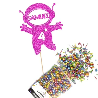 Cakeshop Cake Decoration Pack Astronaut Spaceman Premium Double Sided Glitter Card Topper Sign & 25g Party of Sugar Sprinkles Custom Name Age (Bright Pink)