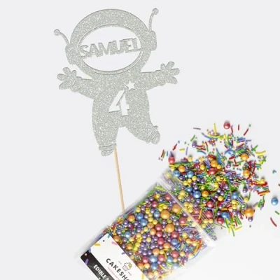 Cakeshop Cake Decoration Pack Astronaut Spaceman Premium Double Sided Glitter Card Topper Sign & 25g Party of Sugar Sprinkles Custom Name Age (Light Silver)